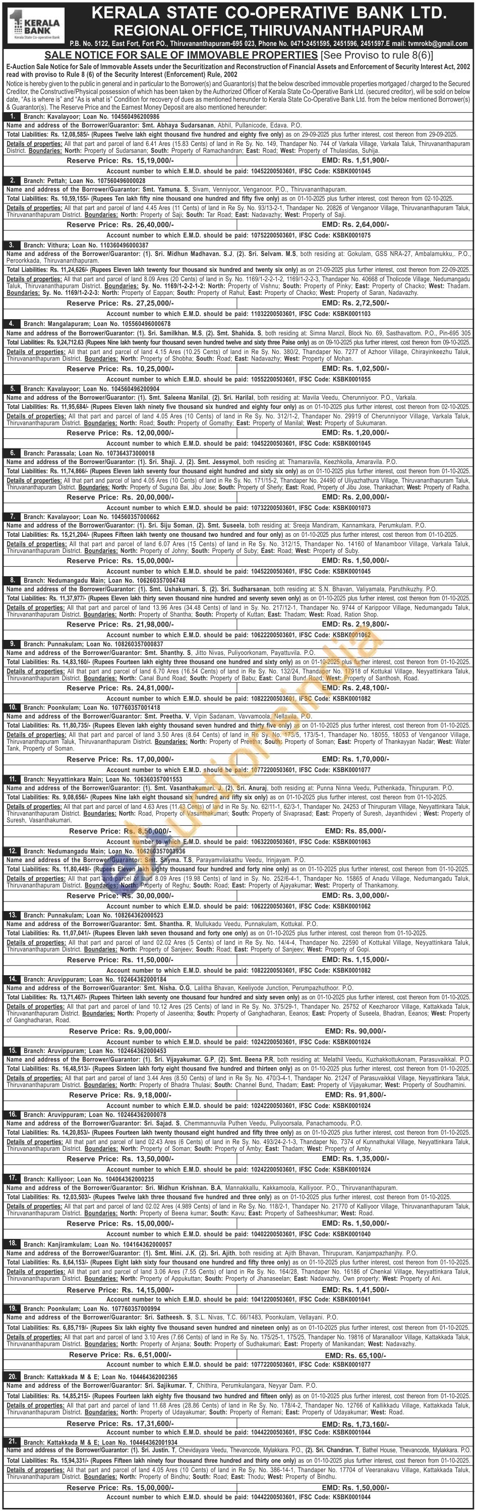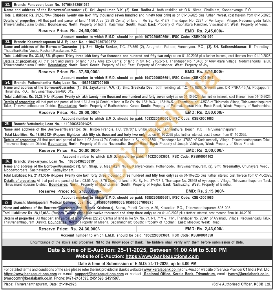 Details of properties: All that part and parcel of land 6.70 Ares (16.54 Cents) of land in Re Sy. No. 132/24, Thandaper No. 17918 of Kottukal Village, Neyyattinkara Taluk, Thiruvananthapuram District. Boundaries: North: Canal Bund Road; South: Property of Babu; East: Canal Bund Road; West: Property of Santhosh, Road