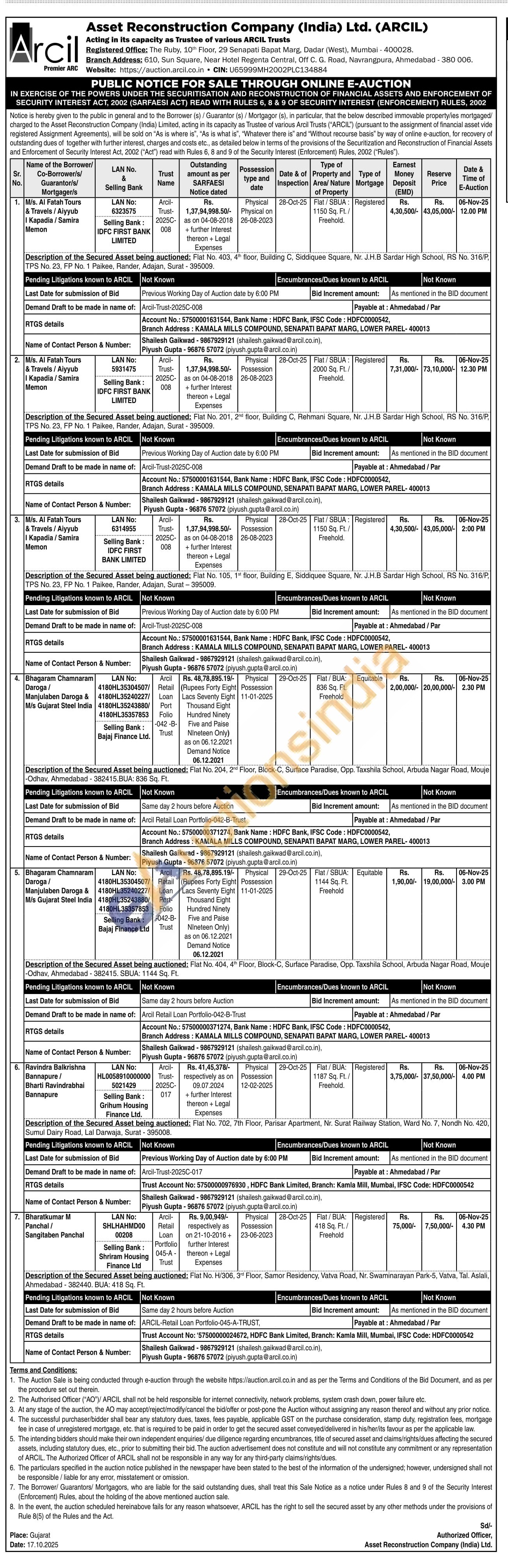 Description of the Secured Asset being auctioned: Flat No. 201, 2nd floor, Building C, Rehmani Square, Nr. J.H.B Sardar High School, RS No. 316/P, TPS No. 23, FP No. 1 Paikee, Rander, Adajan, Surat - 395009.
