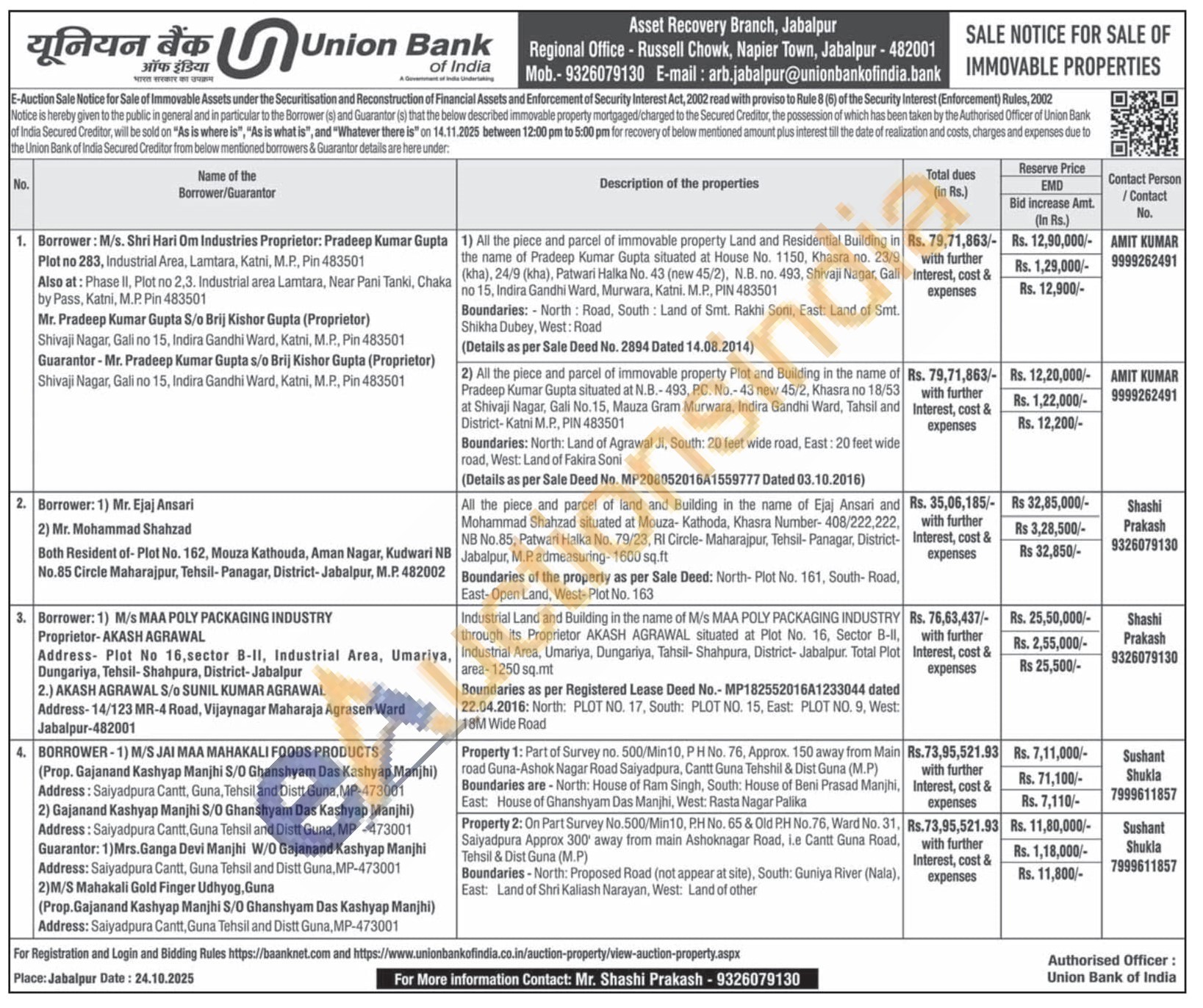 4) Property 2: On Part Survey No.500/Min10, PH No. 65 & Old PH No.76, Ward No. 31, Saiyadpura Approx 300 away from main Ashoknagar Road, Le Cantt Guna Road, Tehsil & Dist Guna (M.P) Boundaries-North: Proposed Road (not appear at site), South: Guniya River (Nala), East: Land of Shri Kallash Narayan, West: Land of other