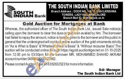 South Indian Bank Gold Auctions Auction in Mangalore