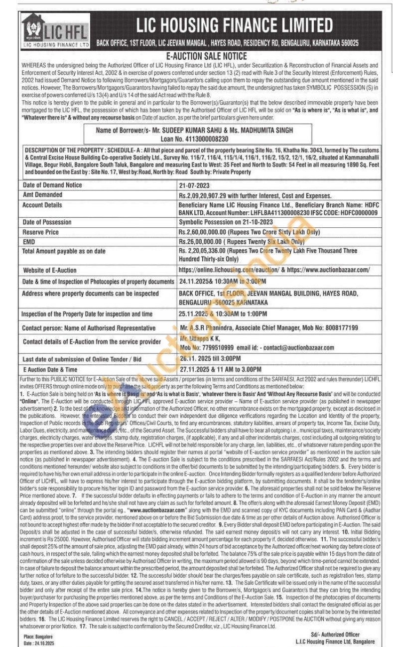 SCHEDULE-A: All that piece and parcel of the property bearing Site No. 16. Khatha No. 3043, formed by The customs & Central Excise House Building Co-operative Society Ltd., Survey No. 116/7, 116/4, 115/1/4, 116/1, 116/2, 15/2, 12/1, 16/2, situated at Kammanahalli Village, Begur Hobli, Bangalore South Taluk, Bangalore and measuring East to West: 35 Feet and North to South: 54 Feet in all measuring 1890 Sq. Feet and bounded on the East by: Site No. 17, West by: Road, North by: Read South by: Private Property