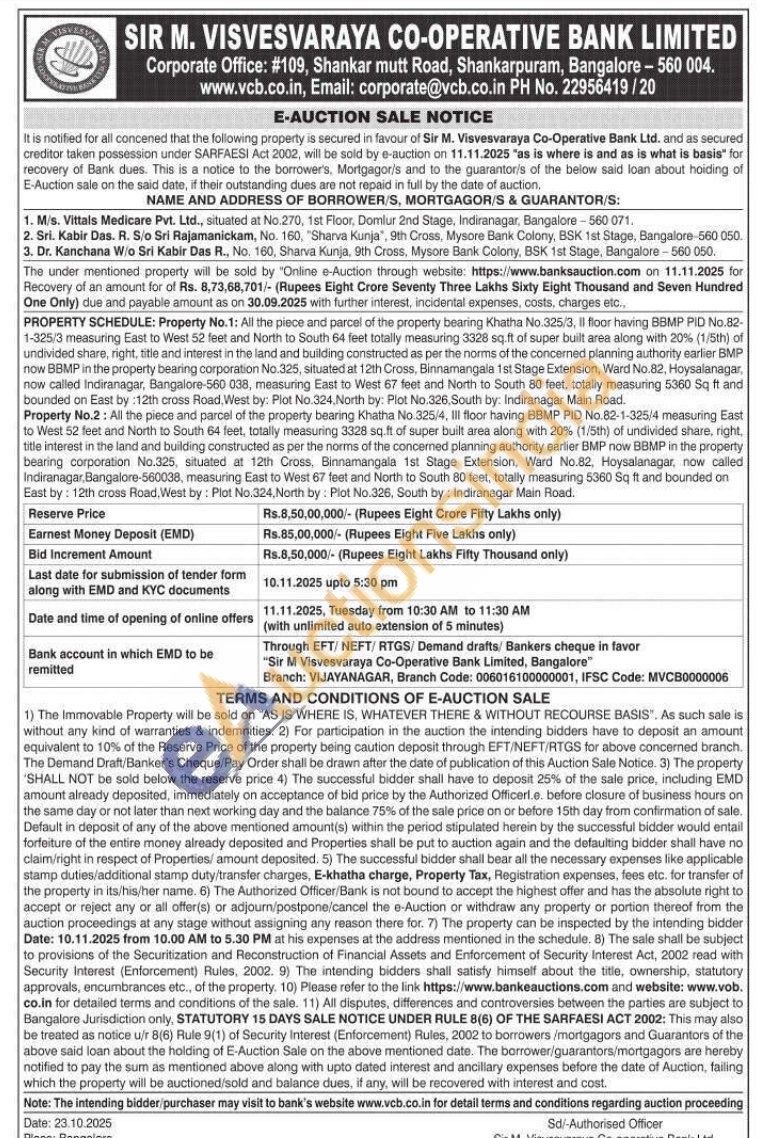 Property No.1: All the piece and parcel of the property bearing Khatha No.325/3, Il floor having BBMP PID No.82- 1-325/3 measuring East to West 52 feet and North to South 64 feet totally measuring 3328 sq ft of super built area along with 20% (1/5th) of undivided share, right, title and interest in the land and building constructed as per the norms of the concerned planning authority earlier BMP now BBMP in the property bearing corporation No.325, situated at 12th Cross, Binnamangala 1st Stage Extension, Ward No.82, Hoysalanagar. now called Indiranagar, Bangalore-560 038, measuring East to West 67 feet and North to South 80 feet, totally measuring 5360 Sq ft and bounded on East by :12th cross Road, West by: Plot No.324, North by: Plot No.326, South by: Indiranagar Main Road.