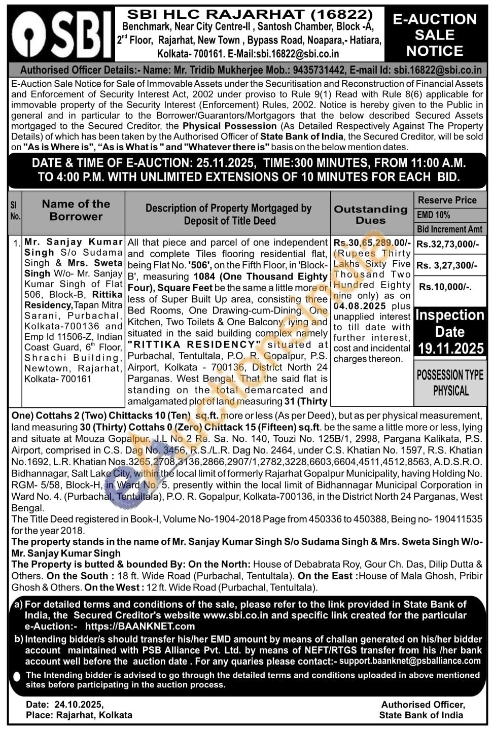Authorised Officer Details : Mr. Tridib Mukherjee Mobile No : 9435731442