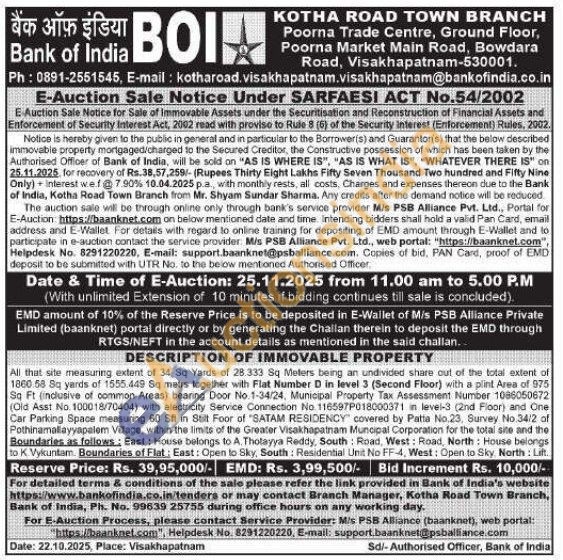 All that site measuring extent of 34 Sq Yards of 28.333 Sq Meters being an undivided share out of the total extent of 1860 58 8q yards of 1555.449 Sq metrs together with Flat Number D in level 3 (Second Floor) with a plint Area of 975 Sq Ft (inclusive of common Areas) bearning Door No. 1-34/24, Municipal Property Tax Assessment Number 1086050672 (Old Asst No. 100018/70404) with electricity Service Connection No 116597P018000371 in level-3 (2nd Floor) and One Car Parking Space measuring 60 Stt in Stilt Foor of 'SATAM RESIDENCY covered by Patta No.23, Survey No.34/2 of Pothinamallayyapalem Village, within the limits of the Greater Visakhapatnam Muncipal Corporation for the total site and the Boundaries as follows: East: House belongs to A. Thotayya Reddy, South Road, West: Road, North: House belongs to K.Vykuntam. Boundaries of Flat: East: Open to Sky, South: Residential Unit No FF-4, West: Open to Sky, North: Lift