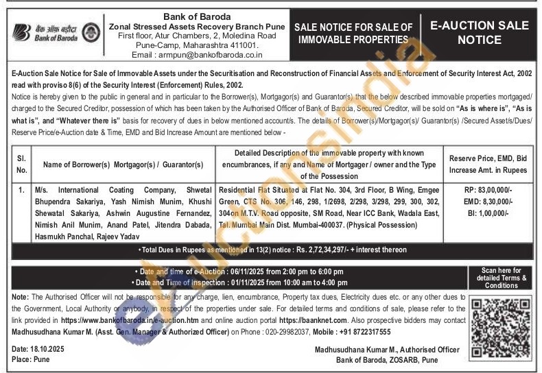 Residential Flat Situated at Flat No. 304, 3rd Floor, B Wing, Emgee Green, CTS No. 306, 146, 298, 1/2698, 2/298, 3/298, 299, 300, 302, , 304 on M.T.V. Road opposite, SM Road, Near ICC Bank, Wadala East, , Tal. Mumbai Main Dist. Mumbai-400037. (Physical Possession)