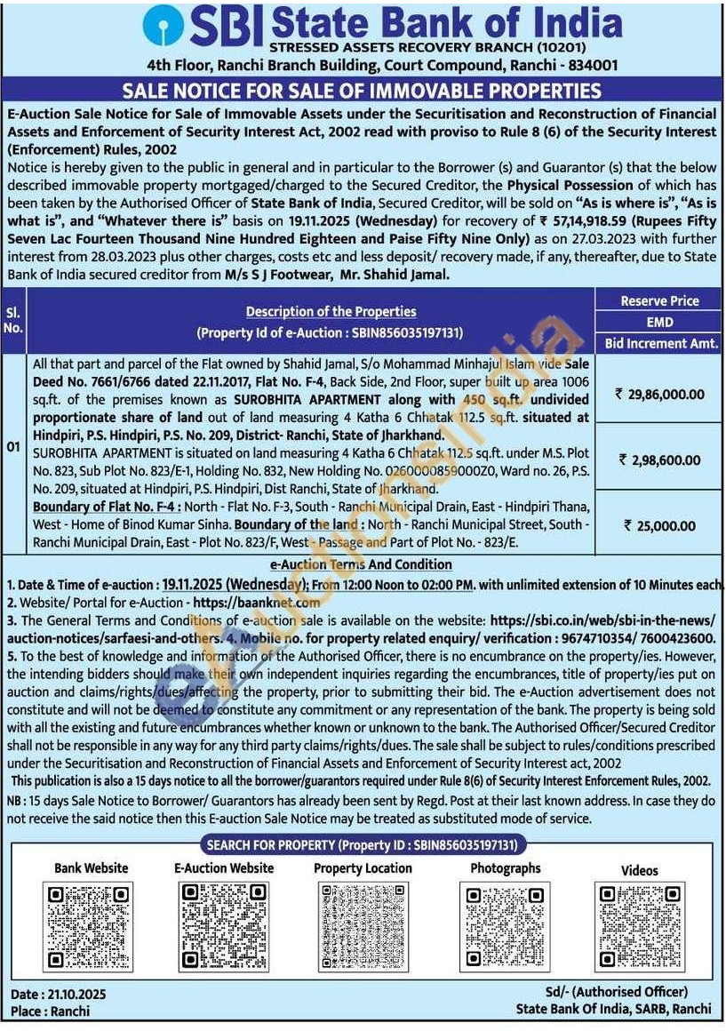 All that part and parcel of the Flat owned by Shahid Jamal, S/o Mohammad Minhajul Islam vide Sale Deed No. 7661/6766 dated 22.11.2017, Flat No. F-4, Back Side, 2nd Floor, super built up area 1006 sq.ft. of the premises known as SUROBHITA APARTMENT along with 450 sq.ft. undivided proportionate share of land out of land measuring 4 Katha 6 Chhatak 112.5 sq.ft. situated at Hindpiri, P.S. Hindpiri, P.S. No. 209, District- Ranchi, State of Jharkhand. 01 SUROBHITA APARTMENT is situated on land measuring 4 Katha 6 Chhatak 112.5 sq.ft. under M.S. Plot No. 823, Sub Plot No. 823/E-1, Holding No. 832, New Holding No. 0260000859000ZO, Ward no. 26, P.S. No. 209, situated at Hindpiri, P.S. Hindpiri, Dist Ranchi, State of Jharkhand. Boundary of Flat No. F-4: North - Flat No. F-3, South - Ranchi Municipal Drain, East - Hindpiri Thana, West - Home of Binod Kumar Sinha. Boundary of the land: North - Ranchi Municipal Street, South -Ranchi Municipal Drain, East - Plot No. 823/F, West - Passage and Part of Plot No. - 823/E.