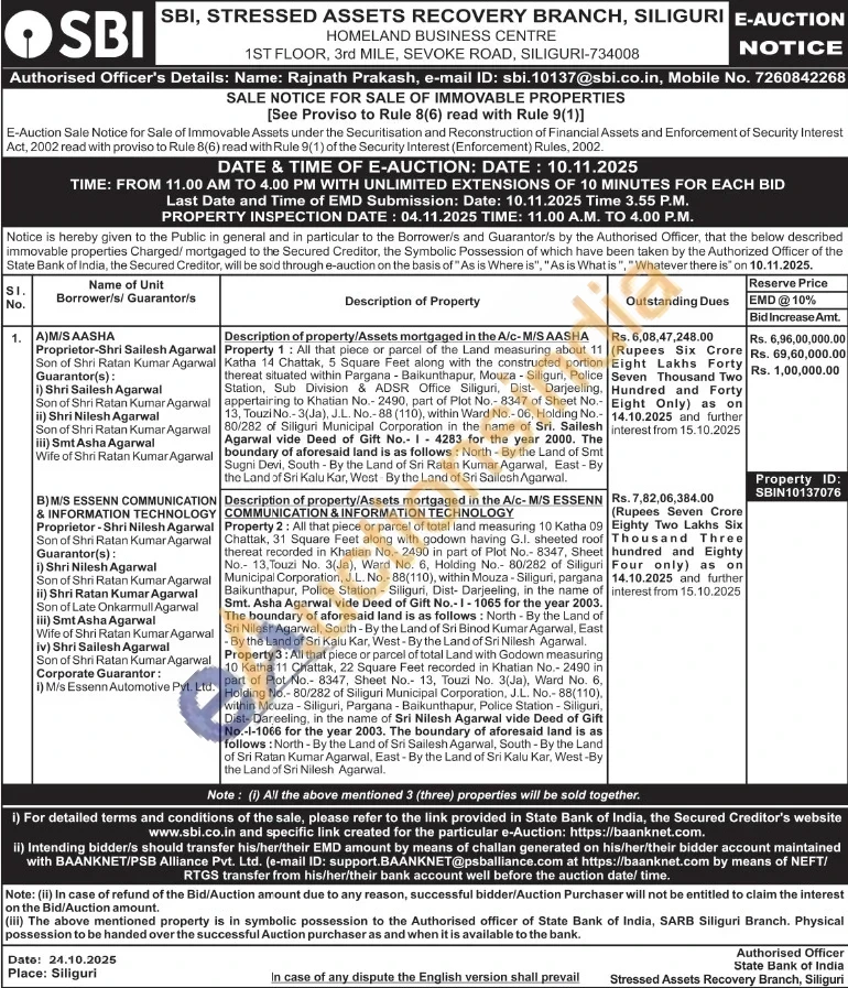 Description of property/Assets mortgaged in the A/c-M/S ESSENN COMMUNICATION & INFORMATION TECHNOLOGY : Property 2: All that piece or parcel of total land measuring 10 Katha 09 Chattak, 31 Square Feet along with godown having G.I. sheeted roof thereat recorded in Khatian No.- 2490 in part of Plot No.- 8347, Sheet No.- 13, Touzi No. 3(Ja), Ward No. 6, Holding No.- 80/282 of Siliguri Municipal Corporation, J.L. No.-88(110), within Mouza - Siliguri, pargana Baikunthapur, Police Station Siliguri, Dist- Darjeeling, in the name of Smt. Asha Agarwal vide Deed of Gift No.-1-1065 for the year 2003. The boundary of aforesaid land is as follows: North By the Land of Sri Nilesh Agarwal, South -By the Land of Sri Binod Kumar Agarwal, East -By the Land of Sri Kalu Kar, West-By the Land of Sri Nilesh Agarwal. Property 3: All that piece or parcel of total Land with Godown measuring 10 Katha 11 Chattak, 22 Square Feet recorded in Khatian No.- 2490 in part of Plot No.- 8347, Sheet No.- 13, Touzi No. 3(Ja), Ward No. 6, Holding No.-80/282 of Siliguri Municipal Corporation, J.L. No.-88(110), within Mouza - Siliguri, Pargana - Baikunthapur, Police Station - Siliguri, Dist- Darjeeling, in the name of Sri Nilesh Agarwal vide Deed of Gift No.-1-1066 for the year 2003. The boundary of aforesaid land is as follows: North - By the Land of Sri Sailesh Agarwal, South-By the Land of Sri Ratan Kumar Agarwal, East -By the Land of Sri Kalu Kar, West-By the Land of Sri Nilesh Agarwal
