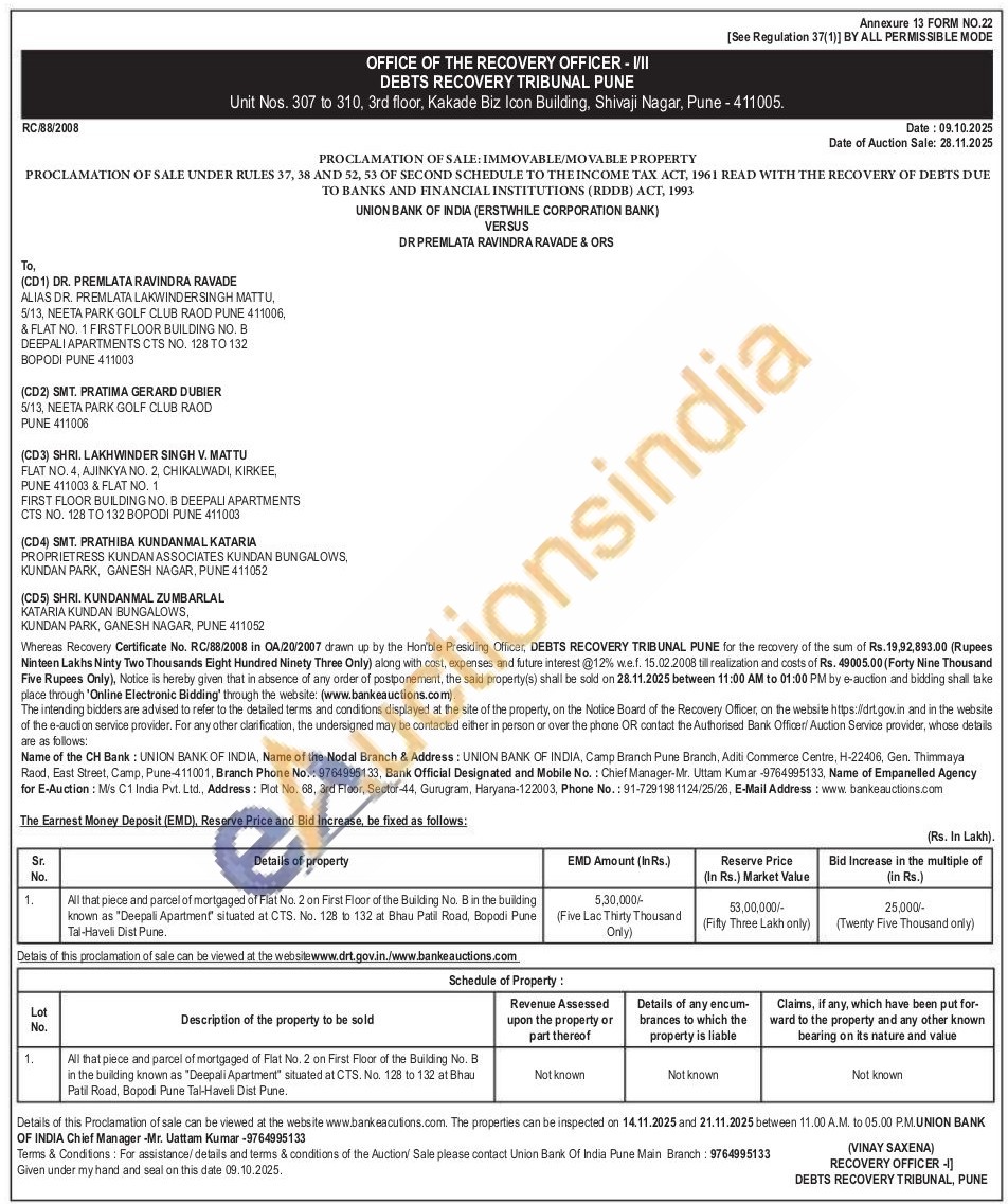 All that piece and parcel of mortgaged of Flat No. 2 on First Floor of the Building No. B in the building known as "Deepali Apartment situated at CTS. No. 128 to 132 at Bhau Patil Road, Bopodi Pune Tal-Haveli Dist Pune.