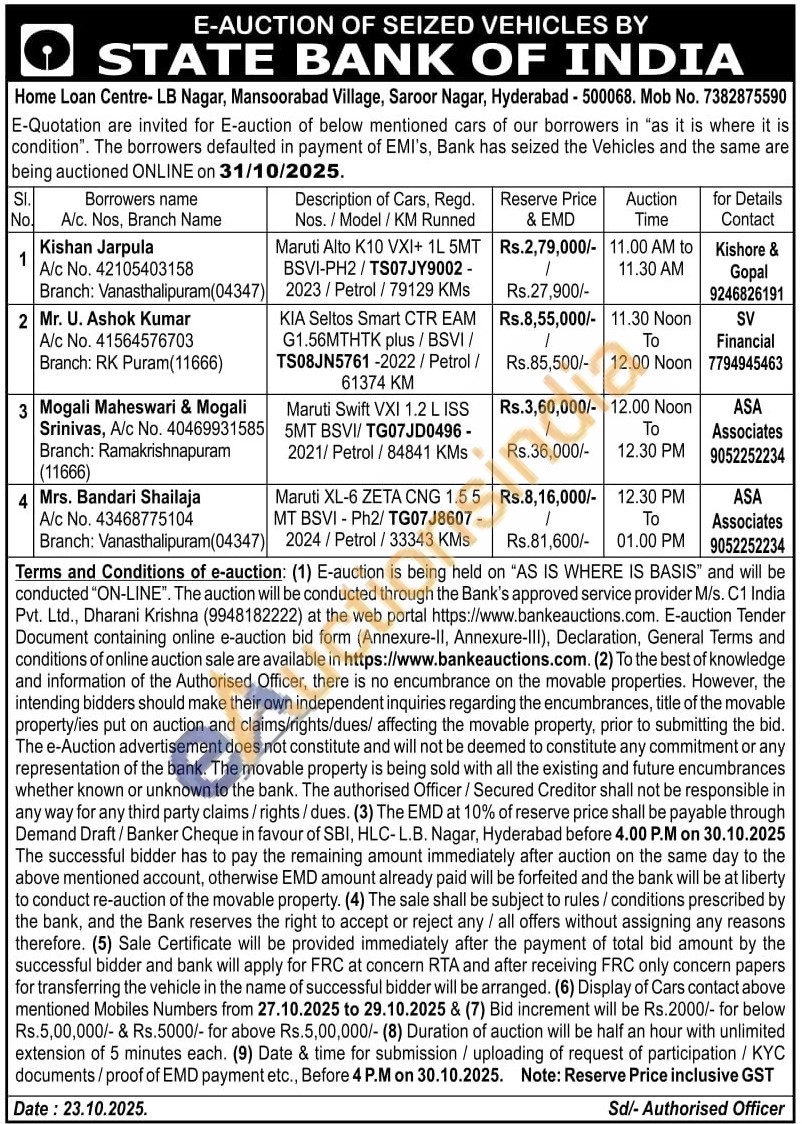 Description of Cars, Regd. Nos./Model/KM Runned : Maruti Swift VXI 1.2 L ISS 5MT BSVI/TG07JD0496 -2021/Petrol/84841 KMs