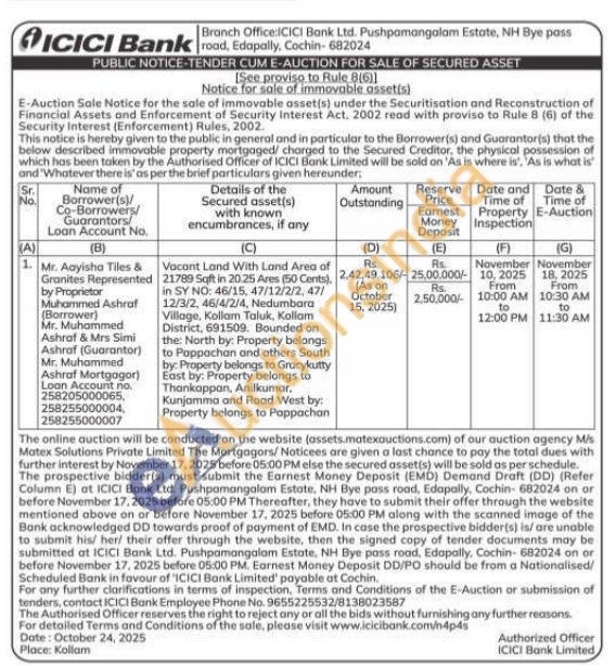 Vacant Land With Land Area of in SY NO: 46/15, 47/12/2/2, 47/12/3/2, 46/4/2/4, Nedumbara 21789 Sqft in 20.25 Ares (50 Cents), Village, Kollam Taluk, Kollam District, 691509. Bounded on the: North by: Property belongs to Pappachan and others South by: Property belongs to Gracykutty East by: Property belongs to Thankappan, Anilkumar, Kunjamma and Road West by: Property belongs to Poppachan