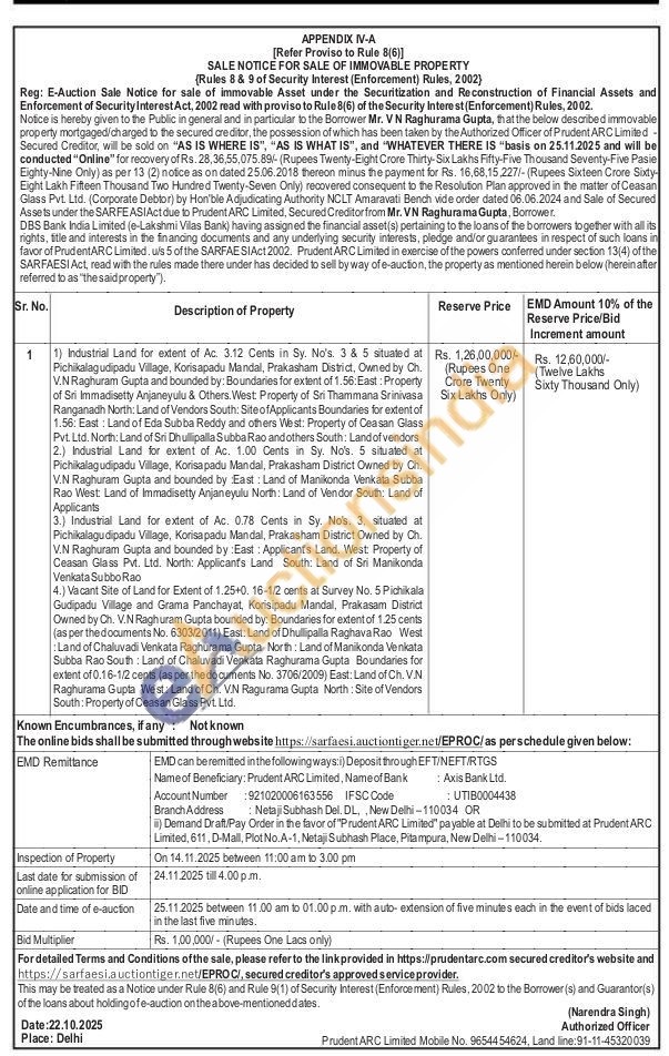 Industrial Land for extent of Ac. 3.12 Cents in Sy. No's. 3 & 5 situated at Pichikalagudipadu Village, Korisapadu Mandal, Prakasham District, Owned by Ch. V.N Raghuram Gupta and bounded by: Boundaries for extent of 1.56:East: Property of Sri Immadisetty Anjaneyulu & Others. West: Property of Sri Thammana Srinivasa Ranganadh North: Land of Vendors South: Site of Applicants Boundaries for extent of 1.56: East: Land of Eda Subba Reddy and others West: Property of Ceasan Glass Pvt. Ltd. North: Land of Sri Dhullipalla Subba Rao and others South: Land of vendors 2.) Industrial Land for extent of Ac. 1.00 Cents in Sy. No's. 5 situated at Pichikalagudipadu Village, Korisapadu Mandal, Prakasham District Owned by Ch. V.N Raghuram Gupta and bounded by East: Land of Manikonda Venkata Subba Rao West: Land of Immadisetty Anjaneyulu North: Land of Vendor South: Land of Applicants