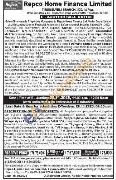 DESCRIPTION OF THE PROPERTY: All the piece and parcel of land together with building situated at Palayamkottal Registration District, Palayamkottai Sub Registration District. Palayamkottai Taluk. Vijayaraghava Mudaliar Chathram Village, Ayan Punjai Adangal Nos. 549 & 550, comprised in Re-Survey No.358, has been laid into layout of house sites named as Thyagaraj Colony, Block No.ll Tirunelveli Corporation, Ward No.19, TVS Nagar, 5th Street, in this Plot No. E-18 is bounded as follows: North by: Plot No. E-17 of Mahadevan, South by: Plot No. E-21, West by: South North 30 feet wide Road, East by: Plot No. E-19 Admeasuring; East to West: 40 feet, South to North: 60 feet, Totally 2400 sq.ft. or 222.97 sq.mtrs, or 5.50 cents. The property has got all mamool, pathway and easement rights thereon and lying within the limits of Tirunelveli Corporation, Ward No.19. TVS Nagar, 5 th Street, Malapalayam Ward Office