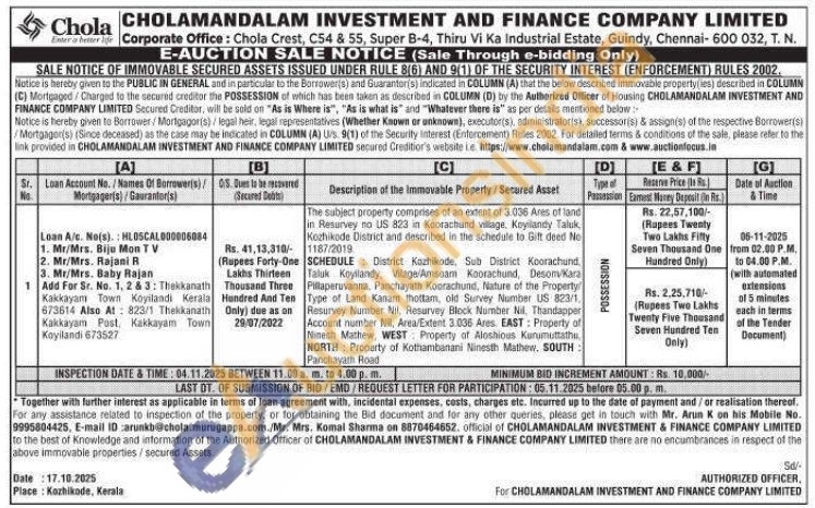 The subject property comprises of an extent of 3:036 Ares of land in Resurvey no US 823 in Koorachund village. Koyilandy Taluk Kozhikode District and described in the schedule to Gift deed No 1187/2018SCHEDULE District Kozhikode, Sub District Koorachund Taluk Koyilandy, Vilage/Amsoam Koorachund, Desom/Kara Pillaperuvanna. Panchayath Koorachund, Nature of the Property Type of Land Kanam thottam, old Survey Number US 823/1, Resurvey Number Nil, Resurvey Block Number Nil. Thandapper Account number Nil, Area/Extent 3036 Ares EAST: Property of Ninesh Mathew, WEST Property of Aloshious Kurumuttathu, NORTH: Property of Kothambanani Ninesth Mathew, SOUTH Panchayath Road