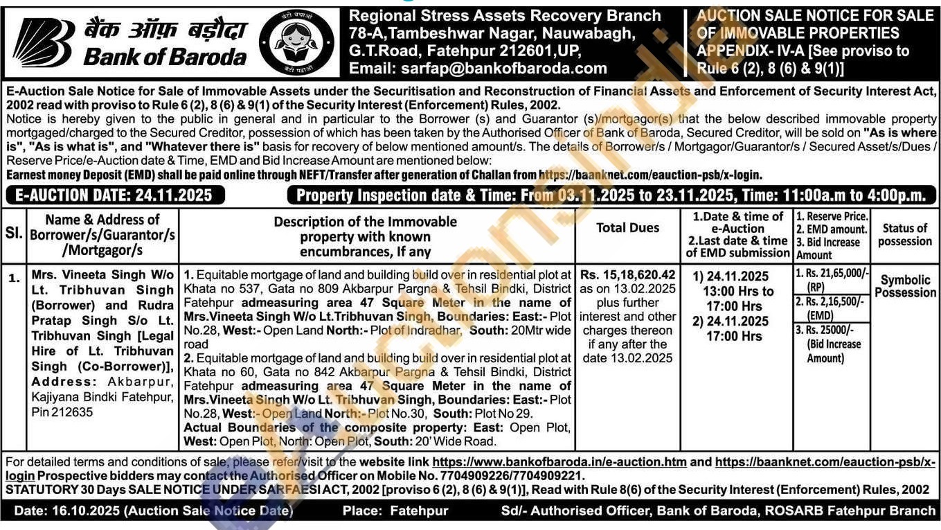 1. Equitable mortgage of land and building build over in residential plot at road Khata no 537, Gata no 809 Akbarpur Pargna & Tehsil Bindki, District Fatehpur admeasuring area 47 Square Meter in the name of Mrs. Vineeta Singh W/o Lt. Tribhuvan Singh, Boundaries: East:- Plot No.28, West: Open Land North:- Plot of Indradhar, South: 20Mtr wide 2. Equitable mortgage of land and building build over in residential plot at Khata no 60, Gata no 842 Akbarpur Pargna & Tehsil Bindki, District Fatehpur admeasuring area 47 Square Meter in the name of Mrs. Vineeta Singh W/o Lt. Tribhuvan Singh, Boundaries: East:- Plot No.28, West:-Open Land North:-Plot No.30, South: Plot No 29. Actual Boundaries of the composite property: East: Open Plot, West: Open Plot, North: Open Plot, South: 20' Wide Road