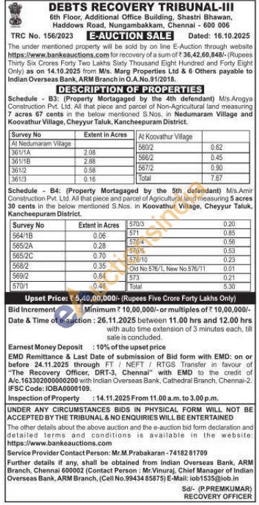 Schedule B3: (Property Mortagaged by the 4th defendant) M/s Arogya Construction Pvt. Ltd. All that piece and parcel of Non-Agricultural land measuring 7 acres 67 cents in the below mentioned S.Nos, in Nedumaram Village and Koovathur Village, Cheyyur Taluk, Kancheepuram District.Survey No Extent in Acres At Koovathur Village At Nedumaram Village 560/2 0.62 361/1A 2.08 566/2 0.45 361/1B 2.88 567/2 0.90 361/2 0.58 Total 7.67 36173 0.16 Schedule B4: (Property Mortagaged by the 5th defendant) M/s.Amir Construction Pvt. Ltd. All that piece and parcel of Agricultural land measuring 5 acres 30 cents in the below mentioned S.Nos. in Koovathur Village, Cheyyur Taluk, Kancheepuram District. Survey No Extent in Acres 570/3 0.20 564/18 0.06 571 0.85 565/2A 0.28 576/4 0.56 565/20 0.70 576/10 0.23 576/5 0.53 568/2 0.35 Old No.576/1, New No 576/11 0.01 569/2 0.84 573 0.21 570/1 0.48