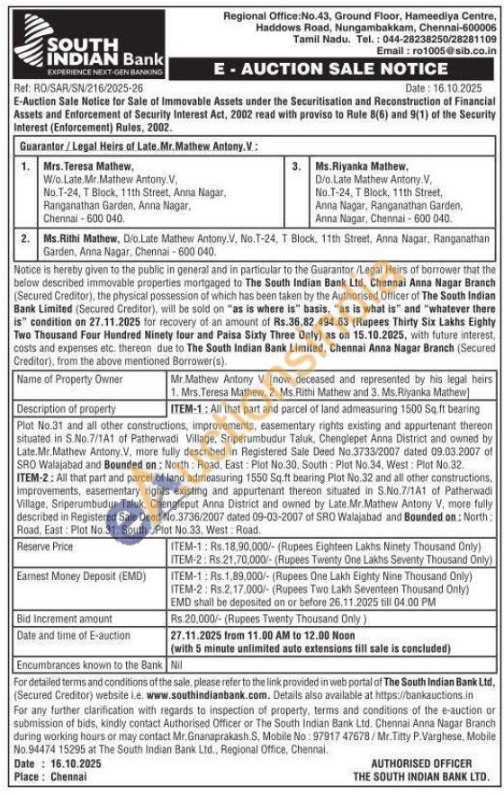 ITEM-2: All that part and parcel of land admeasuring 1550 Sq.ft bearing Plot No.32 and all other constructions, improvements, easementary rights existing and appurtenant thereon situated in S.No.7/1A1 of Patherwadi Village, Sriperumbudur Taluk, Chengleput Anna District and owned by Late Mr.Mathew Antony V, more fully described in Registered Sale Deed No.3736/2007 dated 09-03-2007 of SRO Walajabad and Bounded on: North: Road, East: Plot No.31. South Plot No.33. West: Road
