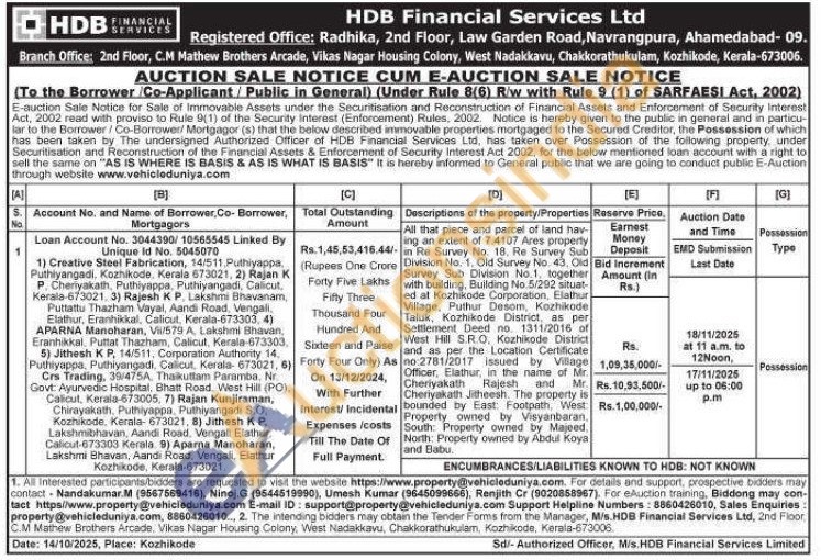 All that piece and parcel of land hav ing an extent of 7.4107 Ares property / in Re Survey No. 18. Re Survey Sub Division No. 1. Old Survey No. 43. Old Survey Sub Division No. 1. together with building, Building No.5/292 situat-ed at Kozhikode Corporation, Elathur Village, Puthur Desom, Kozhikode Taluk, Kozhikode District, as per Settlement Deed no. 1311/2016 of West Hill S.R.O. Kozhikode District and as per the Location Certificate no:2781/2017 issued by Village Officer, Elathur, in the name of Mr. Cheriyakath Rajesh and Mr. Cheriyakath Jitheesh. The property is bounded by East: Footpath, West Property owned by Visyanbaran, South: Property owned by Majeed, North: Property owned by Abdul Koya and Babu