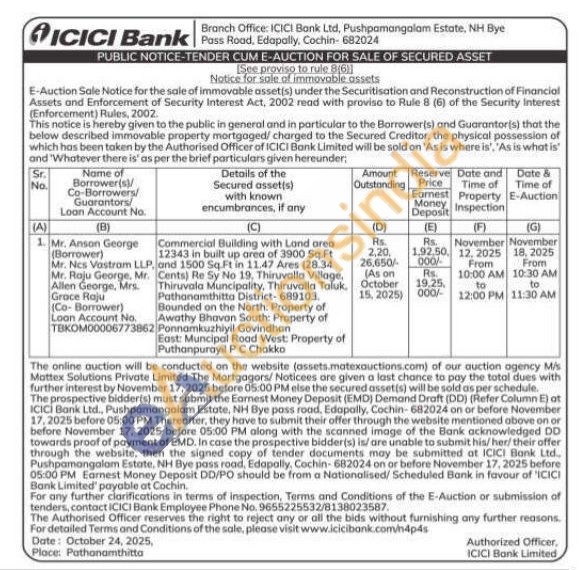 Commercial Building with Land area 12343 in built up area of 3900 Sq.Ft and 1500 Sq.Ft in 11.47 Ares (28.34 Cents) Re Sy No 19, Thiruvalla Village, Thiruvala Muncipality, Thiruvalla Taluk. Pathanamthitta District-689103. Bounded on the North: Property of Awathy Bhavan South: Property of Ponnamkuzhiyil Govindhan East: Muncipal Road West: Property of Puthanpurayil PC Chakko