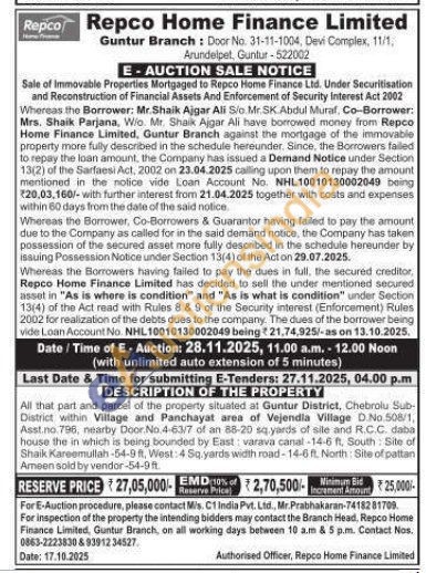 All that part and parcel of the property situated at Guntur District, Chebrolu Sub-District within Village and Panchayat area of Vejendia Village D. No.508/1, Asst.no.796, nearby Door No 4-63/7 of an 88-20 sq yards of sile and R.C.C. daba house the in which is being bounded by East: varava canal -14-6 ft, South Site of Shaik Kareemullah-54-9 ft. West: 4 Sq yards width road-14-6 ft. North: Site of pattan Ameen sold by vendor-54-9 ft.