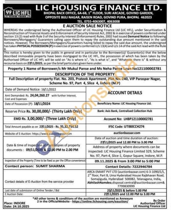 Full Description of property Flat. No. 203, Prateek Apartment, Plot No. 240, VIP Paraspar Nagar, Scheme No. 97, Part 4, Slice 4, Indore (M.P)