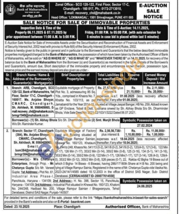 Equitable mortgage of Property 120-122, Bank of Maharashtra, 1st Plot No. 3, admeasuring 85 Sq Jamabandi for the Year 2014-15, situated at Village Jaspal Bangar, HB No. 259, Abbadi known E-as GP Enclave, Tehsil & Distt. Ludhiana onwed by Sh. Abhay Bhola Sio Sh. Dharminder Bhola, Vide Sale Deed No. 2021-22/103/1/3222 Dated 06.07.2021