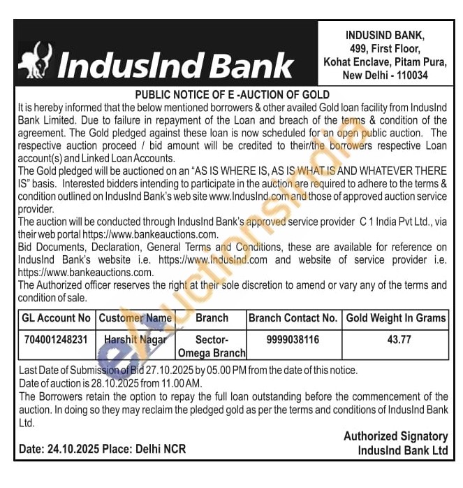 IndusInd Bank Gold Auctions Auction in New Delhi
