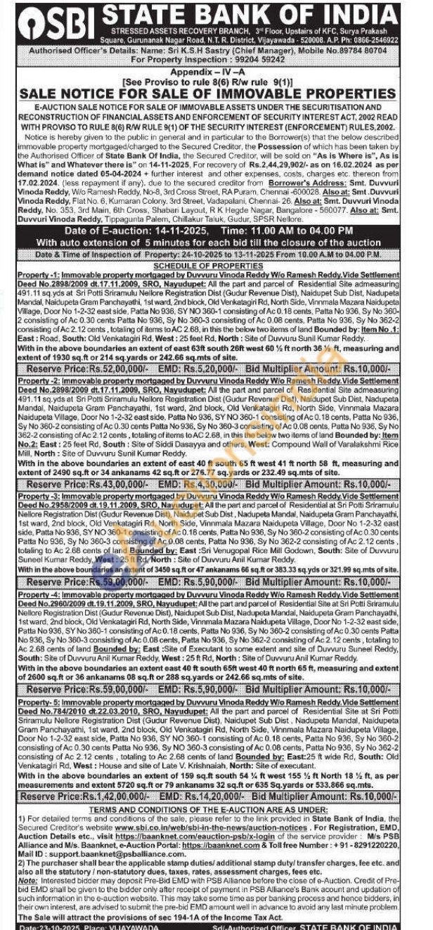 Property -2: Immovable property mortgaged by Duvvuru Vinoda Reddy W/o Ramesh Reddy. Vide Settlement Deed No.2898/2009 dt.17.11.2009, SRO, Nayudupet: All the part and parcel of Residential Site admeasuring 491.11 sq.yds at Sri Potti Sriramulu Nellore Registration Dist (Gudur Revenue Dist), Naidupet Sub Dist, Nadupeta Mandal, Naidupeta Gram Panchayathi, 1st ward, 2nd block, Old Venkatagiri Rd, North Side, Vinnmala Mazara Naidupeta Village, Door No 1-2-32 east side. Patta No 936, SY NO 360-1 consisting of Ac 0.18 cents, Patta No 936, Sy No 360-2 consisting of Ac 0.30 cents Palta No 936, Sy No 360-3 consisting off Ac 0.08 cents, Patta No 936, Sy No 362-2 consisting of Ac 2.12 cents, totaling of items to AC 2.68, in this the below two items of land Bounded by: Item No.2: East: 25 feet Rd, South: Site of Siddi Dasayya and others, West: Compound Wall of Varalakshmi Rice Mill, North: Site of Duvvuru Sunil Kumar Reddy.