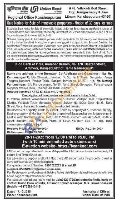 In Vellore district, Arakkonam Registration District, Walajah Sub. Registration District, Walajah Taluk, Sengadu Village, Survey No. 102/3, Door No.33, Tank Street. Vacant site and house building constructed therein,Boundaries of property- North by Street, South by property of Kuzhandhai Reddy, East by property of Munisamy, West by property of Balasundharam. Measurement-East to West Northem side 40 feet, East to West Southern side 42% feet, North lo South Eastern side 117 feet, North to South Western side 111 feet, Total measurement 4702 Sq. ft.