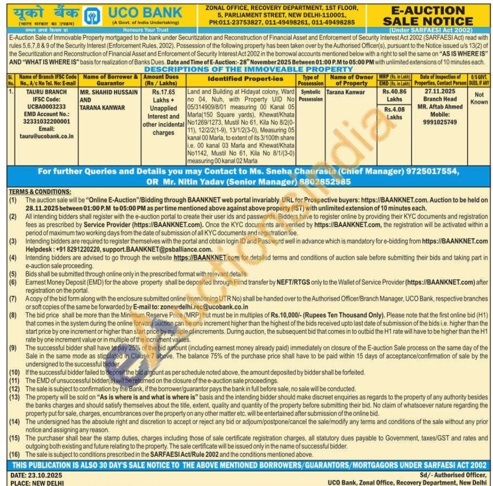 Land and Building at Hidayat colony, Ward no 04, Nuh, with Property UID No 05/314909/8/01 measuring 00 Kanal 05 María (150 Square yards), Khewat/Khata No1269/1273, Mustil No 61, Kila No 8/2(0-11), 12/2/2(1-9), 13/1/2(3-0), Measuring 05 kanal 00 Marla, to extent of its 3/100th share i.e. 00 kanal 03 Marla and Khewat/Khata No1142, Mustil No 61. Kila No 8/1/(3-0) measuring 00 kanal 02 Marla