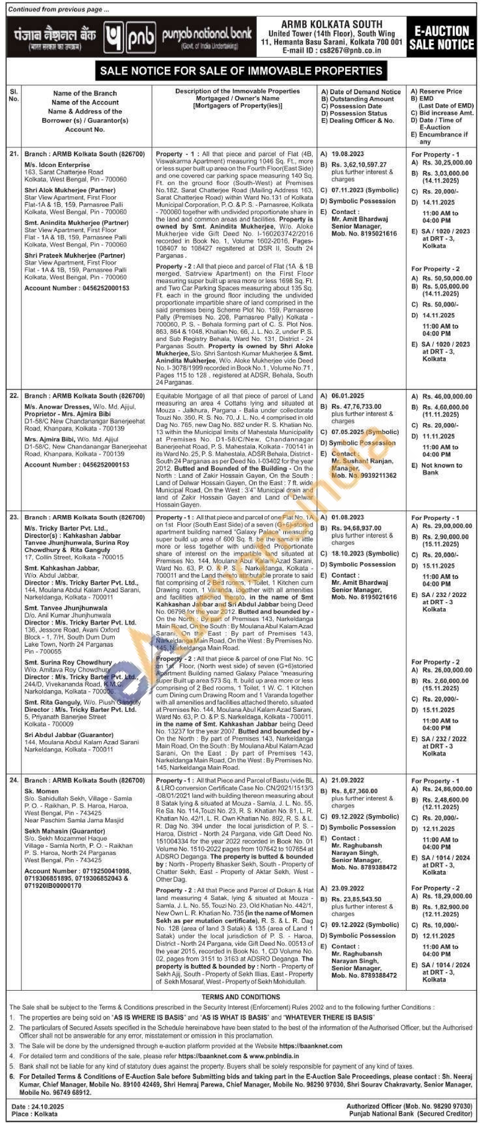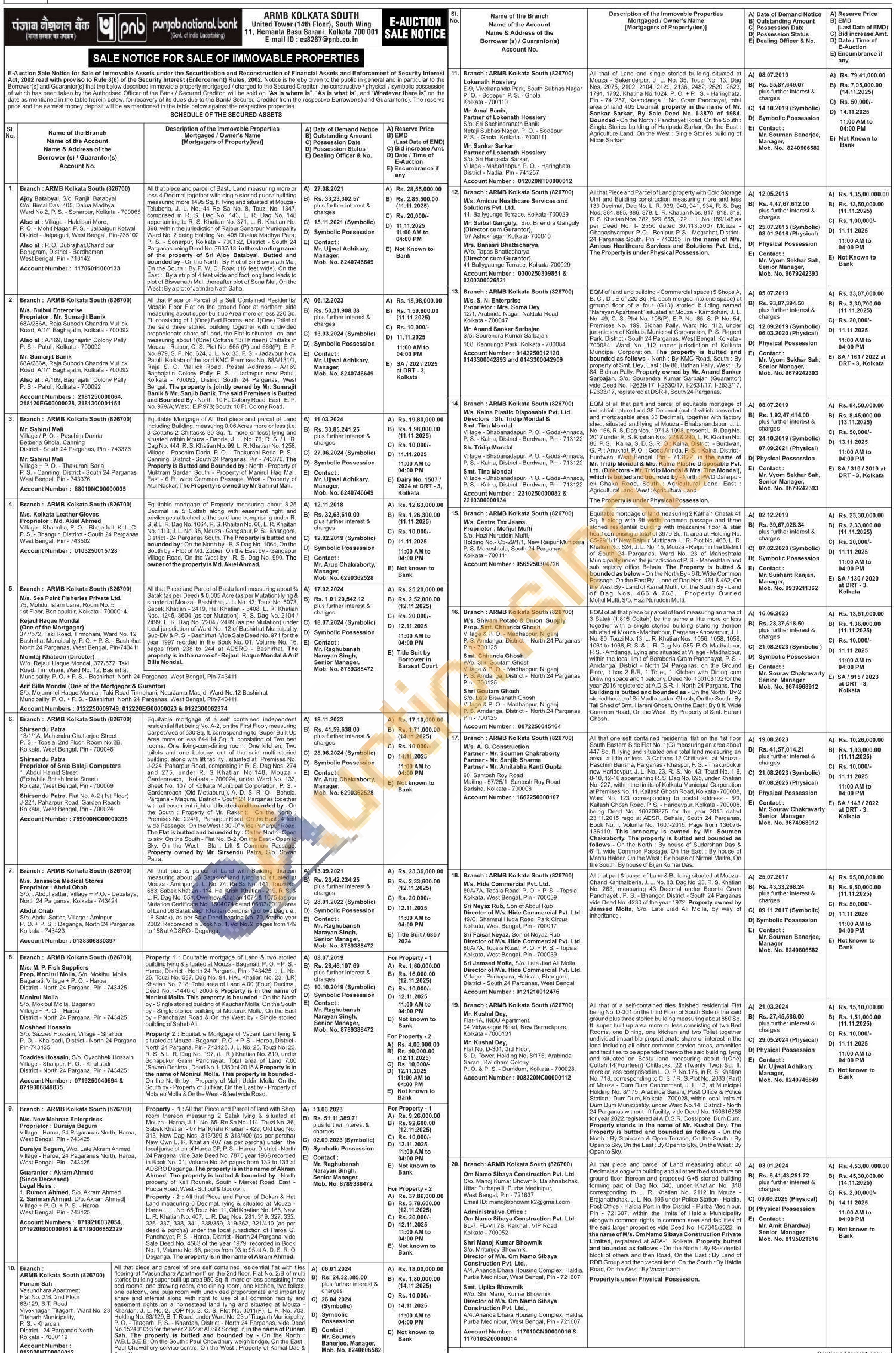 Property-2: All that piece and parcel of Flat (1A & 18 merged. Satrview Apartment) on the First Floor measuring super built up area more or less 1698 Sq. Ft. and Two Car Parking Spaces measuring about 135 Sq. Ft. each in the ground floor including the undivided proportionate impartible share of land comprised in the said premises being Scheme Plot No. 159, Parnasree Pally (Premises No. 208, Parnasree Pally) Kolkata 700060, P. S. Behala forming part of C. S. Plot Nos. 863, 864 & 1045, Khatian No. 66, J. L. No. 2, under P. S. and Sub Registry Behala, Ward No. 131, District - 24 Parganas South. Property is owned by Shri Aloke Mukherjee, S/o, Shri Santosh Kumar Mukherjee & Smt. Anindita Mukherjee, W/o. Aloke Mukherjee vide Deed No. 1-3078/1999 recorded in Book No. 1, Volume No. 71, Pages 115 to 128, registered at ADSR, Behala, South 24 Parganas.