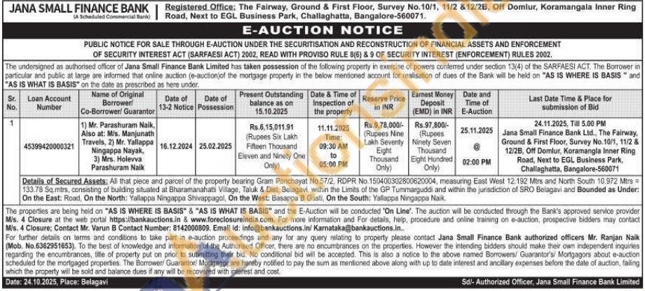 Details of Secured Assets: All that piece and parcel of the property bearing Gram Panchayat No. 57/2, RDPR No.150400302800620004, measuring East West 12.192 Mitrs and North South 10.972 Mtrs = 133.78 So mtrs, consisting of building situated at Bharamanahatti Village, Taluk & Dist. Belagavi, within the Limits of the GP Tummarguddi and within the jurisdiction of SRO Belagavi and Bounded as Under: On the East: Road, On the North: Yallappa Ningappa Shivappagol, On the West: Basappa B Gasti, On the South: Yallappe Ningappa Naik