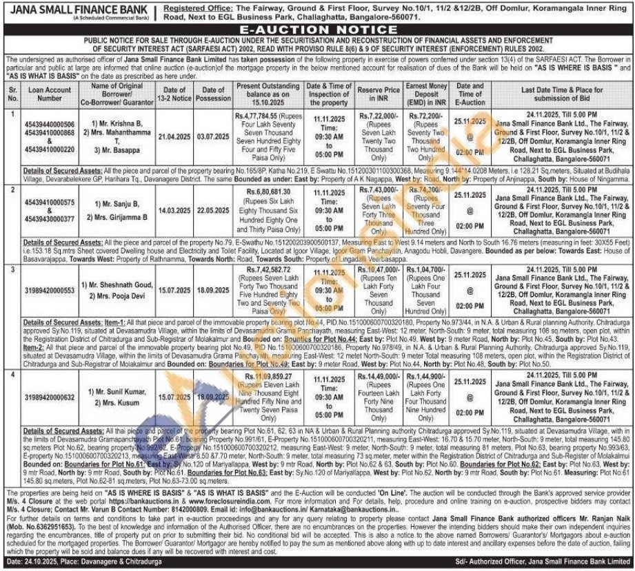 Details of Secured Assets: Item-1: All that piece and parcel of the immovable property bearing plot No.44, PID, No. 151000600700320180, Property No.973/44, in N.A. & Urban & Rural planning Authority, Chitradurga approved Sy No 119, situated at Devasamudra Village, within the limits of Devasamudra Grama Panchayath, measuring East-West: 12 meter, North-South: 9 meter, total measuring 108 sq meters, open plot, within the Registration District of Chitradurga and Sub-Registrar of Molakalmur and Bounded on: Bounties for Plot No.44; East by: Plot No.49. West by: 9 meter Road, North by: Plot No.45. South by: Plot No.43. Item-2: All that piece and parcel of the immovable property bearing plot No.49, PID No. 151000600700320186, Property No.978/49, in N.A. & Urban & Rural Planning Authority, Chitradurga approved Sy.No.119, situated at Devasamudra Village, within the limits of Devasamudra Grama Panchayath, measuring East-West: 12 metet North-South: 9 meter Total measuring 108 meters, open plot, within the Registration District of Chitradurga and Sub-Registrar of Molakalmur and Bounded on: Boundaries for Plot No.49: East by: 9 meter Road, West by: Plot No.44, North by: Plot No 48, South by: Plot No.50
