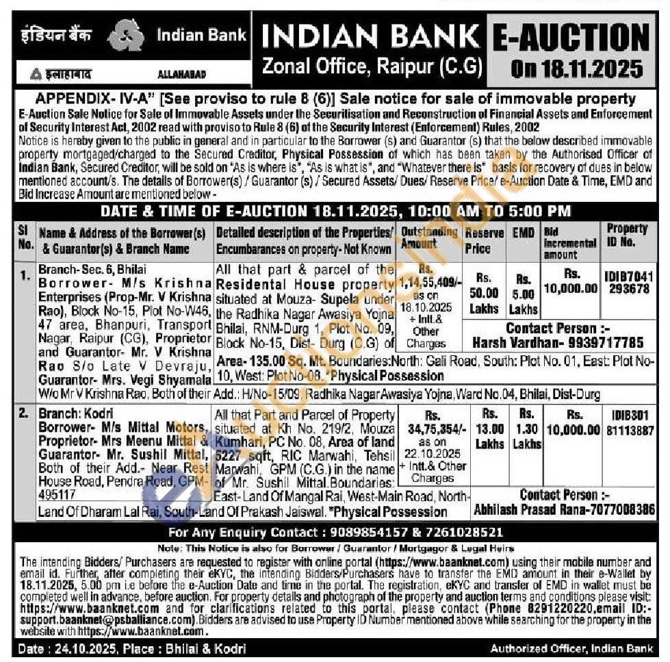 All that Part and Parcel of Property situated at Kh No. 219/2, Mouza Kumhari, PC No. 08, Area of land 5227 sqft, RIC Marwahi, Tehsil Marwahi, GPM (C.G.) in the name of Mr. Sushil Mittal Boundaries: East-Land Of Mangal Rai, West-MainRoad, North-Land Of Dharam Lal Rai, South-Land Of Prakash Jaiswal. "Physical Possession