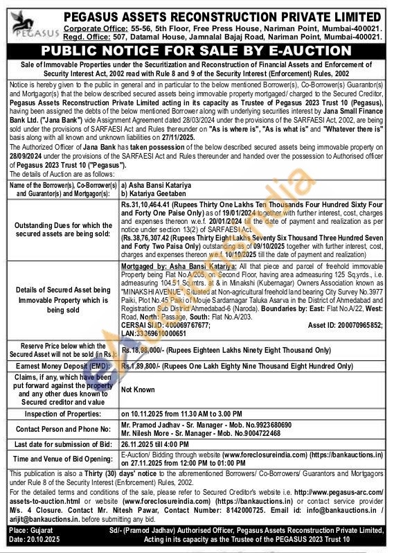 Mortgaged by: Asha Bansi Katariya: All that piece and parcel of freehold immovable Property being Flat No.A/205, on Second Floor, having area admeasuring 125 Sq.yrds., i.e. admeasuring 104.51 Sq.mtrs. at & in Minakshi (Kubernagar) Owners Association known as "MINAKSHI AVENUE", Situated at Non-agricultural freehold land bearing City Survey No. 3977 Paiki, Plot No.45 Paiki of Mouje Sardarnagar Taluka Asarva in the District of Ahmedabad and Registration Sub District Ahmedabad-6 (Naroda). Boundaries by: East: Flat No.A/22, West: Road, North: Passage, South: Flat No.A/203. CERSAI SI.ID: 400069767677;