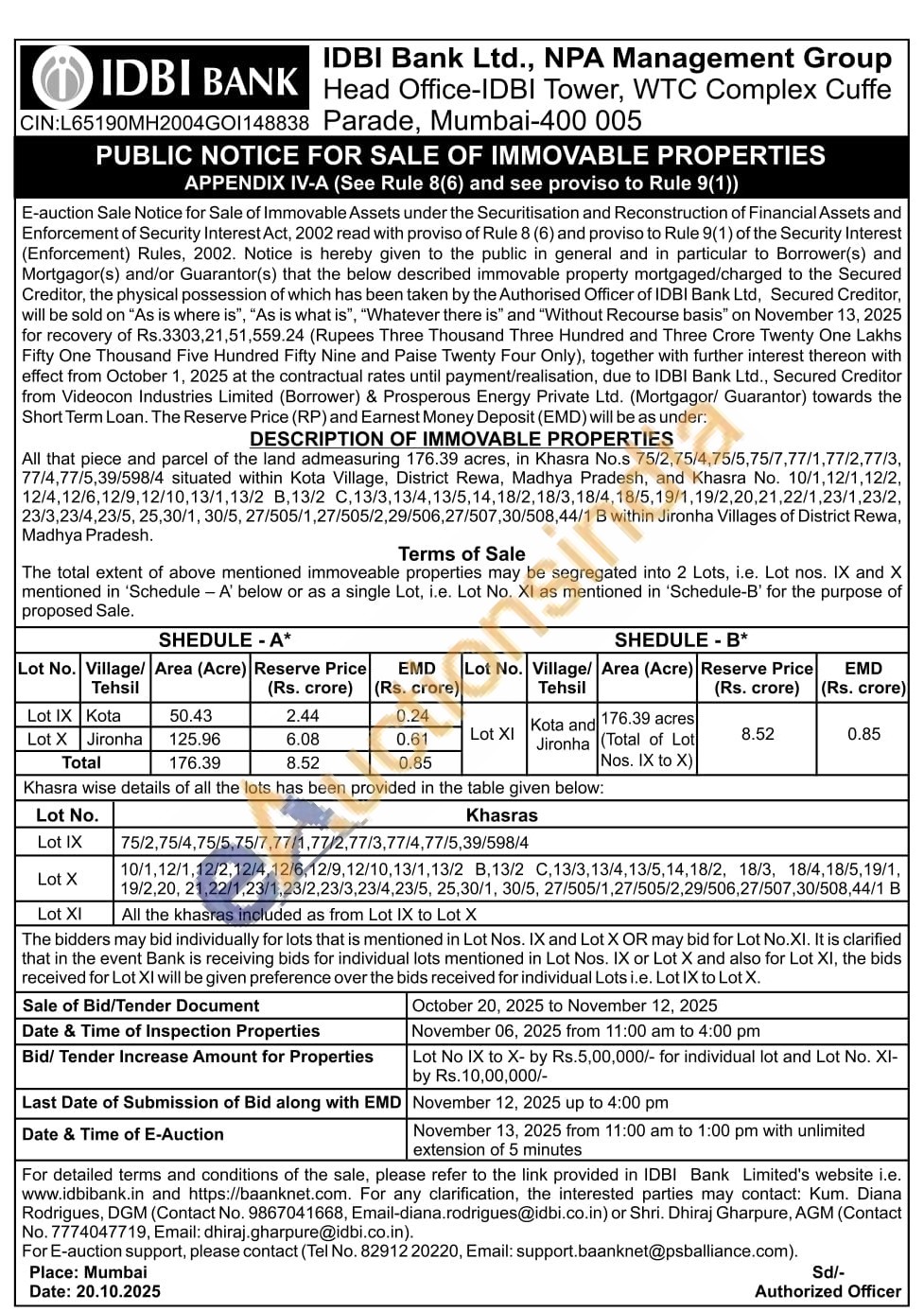 All that piece and parcel of the land admeasuring 176.39 acres, in Khasra No.s 75/2,75/4,75/5,75/7,77/1,77/2,77/3, 77/4,77/5,39/598/4 situated within Kota Village, District Rewa, Madhya Pradesh, and Khasra No. 10/1,12/1,12/2, 12/4,12/6,12/9,12/10,13/1,13/2 B,13/2 C,13/3, 13/4, 13/5,14,18/2, 18/3, 18/4,18/5,19/1,19/2,20,21,22/1,23/1,23/2, 23/3,23/4,23/5, 25,30/1, 30/5, 27/505/1,27/505/2,29/506,27/507,30/508,44/1 B within Jironha Villages of District Rewa, Madhya Pradesh.