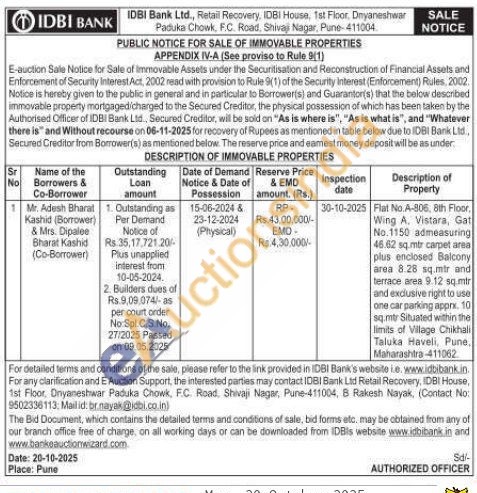 Flat No.A-806, 8th Floor, Wing A, Vistara, Gat No.1150 admeasuring 46.62 sq.mtr carpet area plus enclosed Balcony area 8.28 sq.mir and terrace area 9.12 sq mir and exclusive right to use one car parking apprx. 10 sq.mtr Situated within the limits of Village Chikhali Taluka Haveli, Pune, Maharashtra-411062