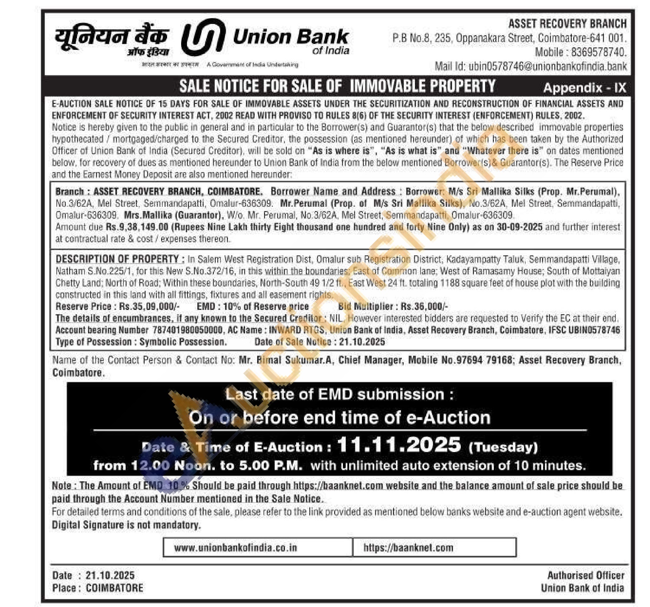In Salem West Registration Dist, Omalur sub Registration District, Kadayampatty Taluk, Semmandapatti Village, Natham S.No.225/1, for this New S.No.372/16, in this within the boundaries, East of Common lane, West of Ramasamy House; South of Mottaiyan Chetty Land: North of Road: Within these boundaries, North-South 49 1/2 ft., East West 24 ft. totaling 1188 square feet of house plot with the building constructed in this land with all fittings, fixtures and all easement rights