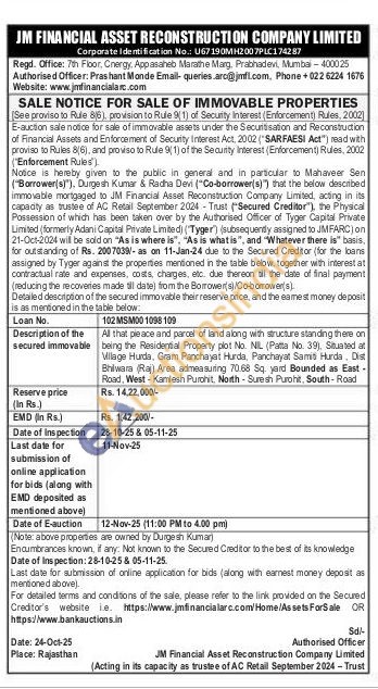 All that pieace and parcel of land along with structure standing there on being the Residential Property plot No. NIL (Patta No. 39), Situated at Village Hurda, Gram Panchayat Hurda, Panchayat Samiti Hurda, Dist Bhilwara (Raj) Area admeasuring 70.68 Sq. yard Bounded as East. Road, West-Kamlesh Purohit, North-Suresh Purohit, South-Road