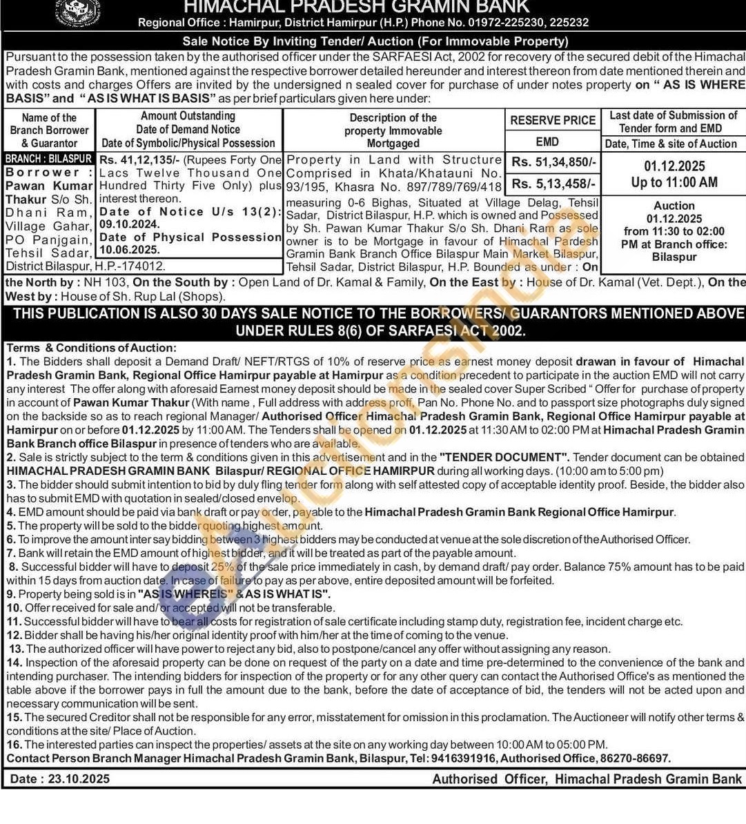 Property in Land with Structure Comprised in Khata/Khatauni No. 93/195 ,Khasra no 897/789/769/418 measuring 0-6 Bighas, Situated at Village Delag, Tehsil Sadar, District Bilaspur, H.P. which is owned and Possessed by Sh. Pawan Kumar Thakur S/o Sh. Dhani Ram as sole owner is to be Mortgage in favour of Himachal Pardesh Gramin Bank Branch Office Bilaspur Main Market Bilaspur, Tehsil Sadar, District Bilaspur, H.P. Bounded as under: On the North by: NH 103, On the South by: Open Land of Dr. Kamal & Family, On the East by: House of Dr. Kamal (Vet. Dept.), On the West by: House of Sh. Rup Lal (Shops).