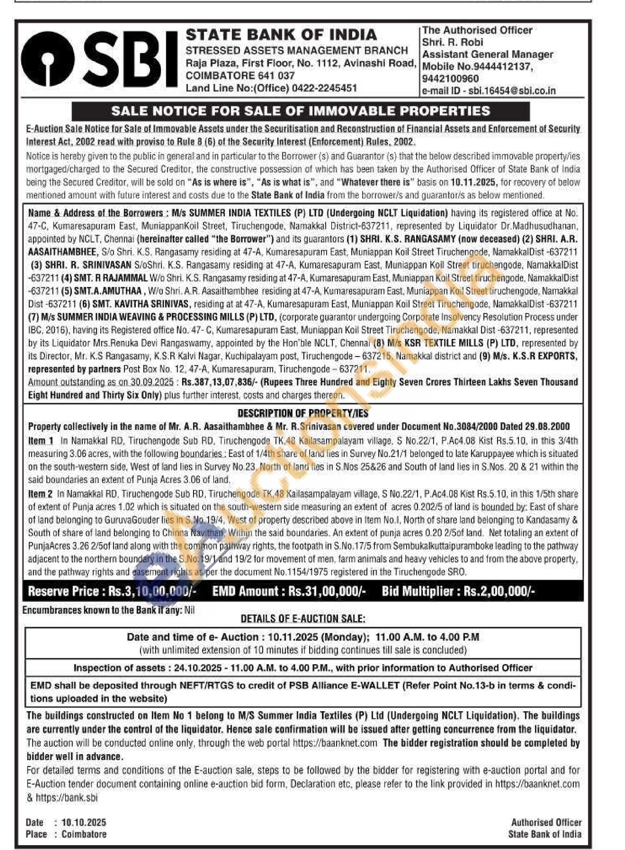 Item 1 In Namakkal RD, Tiruchengode Sub RD, Tiruchengode TK.48 Kailasampalayam village, S No.22/1, P.Ac4.08 Kist Rs.5.10, in this 3/4th measuring 3.06 acres, with the following boundaries. East of 1/4th share of land lies in Survey No. 21/1 belonged to late Karuppayee which is situated on the south-western side, West of land lies in Survey No 23. North of land lies in S. Nos 25&26 and South of land lies in S.Nos. 20 & 21 within the said boundaries an extent of Punja Acres 3.06 of land.