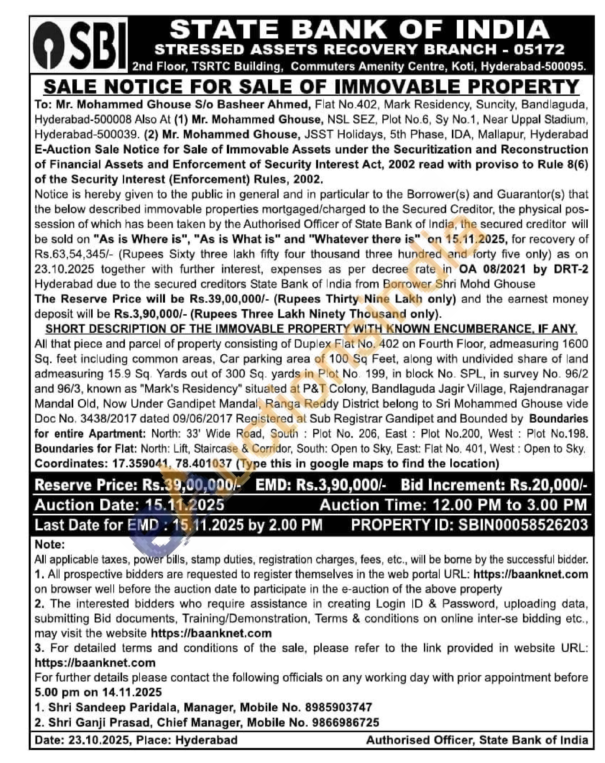 All that piece and parcel of property consisting of Duplex Flat No. 402 on Fourth Floor, admeasuring 1600 Sq. feet including common areas, Car parking area of 100 Sq Feet, along with undivided share of land admeasuring 15.9 Sq. Yards out of 300 Sq. yards in Plot No. 199, in block No. SPL, in survey No. 96/2 and 96/3, known as "Mark's Residency" situated at P&T Colony, Bandlaguda Jagir Village, Rajendranagar Mandal Old, Now Under Gandipet Mandal, Ranga Reddy District belong to Sri Mohammed Ghouse vide Doc No. 3438/2017 dated 09/06/2017 Registered at Sub Registrar Gandipet and Bounded by Boundaries for entire Apartment: North: 33' Wide Road, South Plot No. 206, East Plot No.200, West: Plot No.198. Boundaries for Flat: North: Lift, Staircase & Corridor, South: Open to Sky, East: Flat No. 401, West: Open to Sky. Coordinates: 17.359041, 78.401037 (Type this in google maps to find the location)