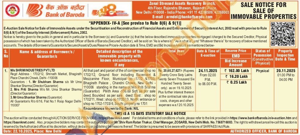 All that part and parcel of the of commercial shop no 1702/12, Ground floor including Basement & Mezzanine Floor, Municipal no 1702 &1703, Bhagirath Palace, Chandni Chowk, New Delhi 110006 standing in the name of Mrs Priti Sharma (Guarantor) Plinth Area -136.69 Sqft as per sale deed, Bounded as per sale deed: East: shop no 1702/11, West: shop no 1702/13, North: entrance or shop no 1702-1703/6, South: property no 1701