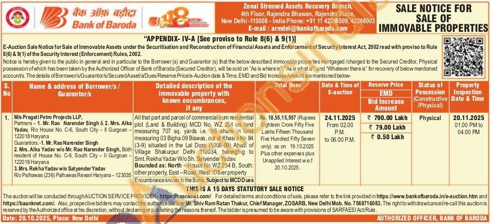 All that part and parcel of commercial cum residential plot (Land & Building) MCD No. WZ 254 on land measuring 707 sq. yards i.e. 1/6 share in land measuring 03 Bigha 09 Biswas, out of Khasra No 84 (3-9) situated in the Lal Dora (1908-09) Abadi of Village Shakurpur Delhi 110034, belonging to Smt. Rekha Yadav W/o Sh. Satyender Yadav.