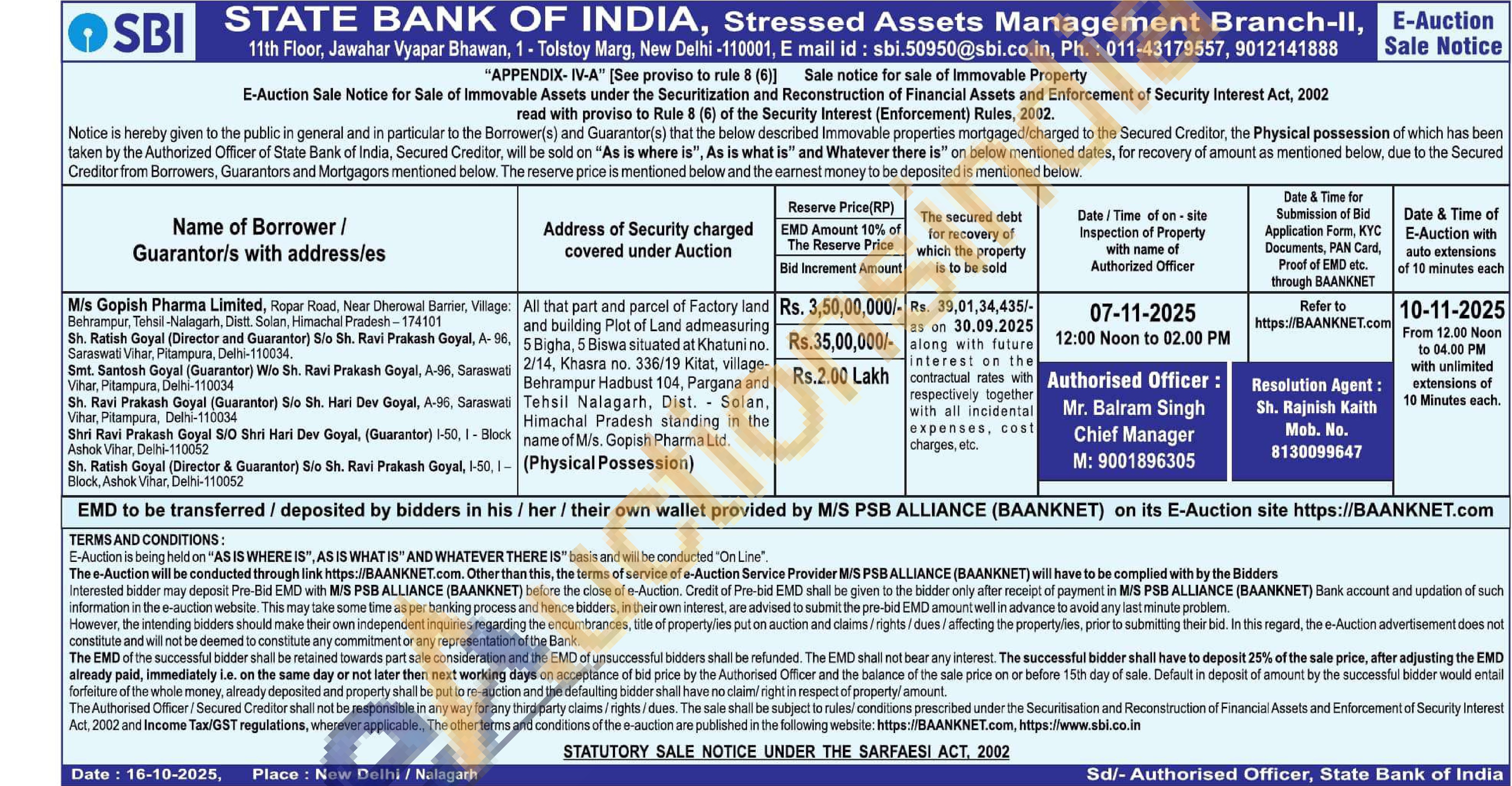 All that part and parcel of Factory land and building Plot of Land admeasuring 5 Bigha, 5 Biswa situated at Khatuni no. 2/14, Khasra no. 336/19 Kitat, village-Behrampur Hadbust 104, Pargana and Tehsil Nalagarh, Dist. Solan, Himachal Pradesh standing in the name of M/s, Gopish Pharma Ltd.
