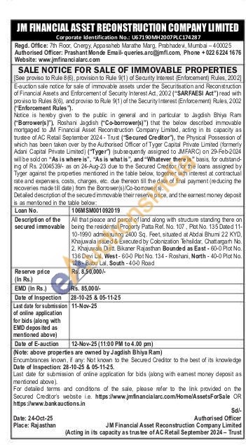 All that pleace and parcel of land along with structure standing there on being the residential Property Patta Ref. No. 107. Plot No. 135 Dated 11-10-1990 admeasuring 2400 Sq. Feet, situated at Abdai Bhumi 22 KYD Khajuwala issued & Executed by Colonization Tehsildar, Chattargarh No. 2. Khajuwala Distt. Bikaner Rajasthan Bounded as East-60-0 Plot No. 136 Devi Lal, West-600 Plot No. 134-Roshari. North-40-0 Plot No. 128-Babu Lal, South-400 Road