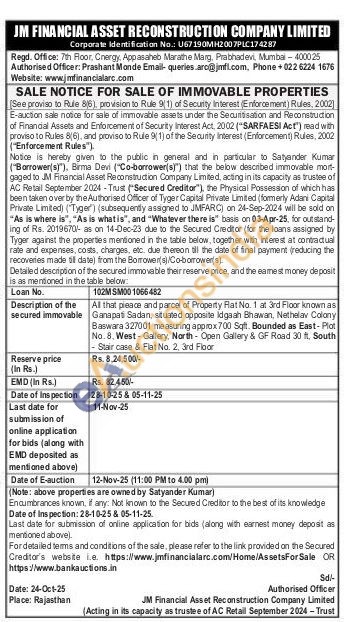 All that pieace and parcel of Property Flat No. 1 at 3rd Floor known as Ganapati Sadan, situated opposite Idgaah Bhawan, Nethelav Colony Baswara 327001 measuring approx700 Sqft. Bounded as East-Plot No. 8. West-Gallery, North Open Gallery & GF Road 30 ft. South Stair case & Flat No. 2, 3rd Floor
