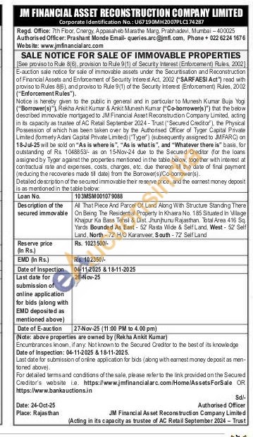 All That Piece And Parcel Of Land Along With Structure Standing There On Being The Residential Property in Khasra No. 185 Situated in Village Khajpur Ka Bass Tehsil & Dist. Jhunjhunu Rajasthan Total Area 416 Sq Yards Bounded As East-52 Rasta Wide & Self Land, West-52. Self Land, North-72 HIO Karanveer, South-72 Self Land
