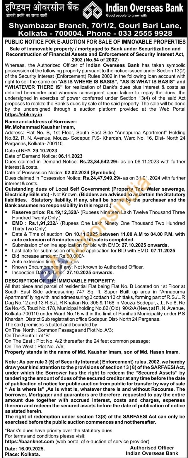 All that piece and parcel of residential Flat being Flat No. B Located on 1st Floor at South East Side admeasuring 747 Sq. ft. Super Built up area in "Annapurna Apartment" lying with land admeasuring 3 cottach 13 chittaks, forming part of R.S./L.R Dag No. 12 and 13 R.S./L.R Khatian No. 305 & 1168 in Mouza-Sodepur, J.L. No.8, Re Sa No.45, Touzi No. 178, Municipal holding No.82 (Old) 90/2/A (New) at R. N. Avenue, Kolkata-700110 under Ward No. 16 within the limit of Panihati Municipality under P.S