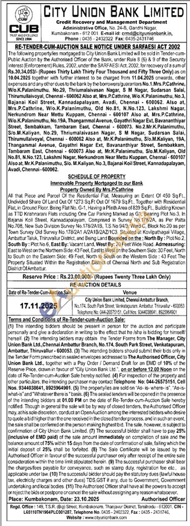 All that Piece and Parcel Of the Residential Flat Measuring an Extent Of 450 Sq Ft, Undivided Share Of Land Out Of 1273 Sq.Ft Out Of 1679 Sq Ft. Together with Residential Flat, in Ground Floor, Being Flat No. G-1, Having a Plinth Area of 839 Sq.Ft., Building Known as TTD Krishnarans Flats including One Car Parking Marked as G1, Bearing Plot No.3, In Bajanai Koll Street, Kannadapalayam, Comprised in Survey No 178/2A, as Per Patta No. 708, New Sub Division Survey No. 178/2A1B, TS No 94/3, Ward C, Block No.20 as per Town Survey Old Survey No. 178/2A1 A/2A1B/2AZ/1C3 Situated at Kovilpathagai Village, Ambattur Taluk, Thiruvallur District, and Being Land Bounded on the North By: Plot No.2. South By: Plot No.6, East By: Vacant Land, West By: 20 Feet Wide Road. Admeasuring: East to West on the Northem Side: 43 Feet, East to West on the Southern Side: 30 Feet, North to South on the Eastern Side: 49 Feet, North to South on the Westem Side: 43 Feet The Property Situated Within the Registration District of Chennai North and Sub Registration District Of Ambattur.