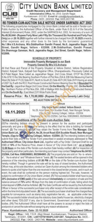 All that Piece and Parcel of the Property Situated at Vellore District, Vellore Registration District, Katpadi Taluk, Katpadi Sub Registrar Office, Dharapadavedu, Previously Called as N.F.Patel Nagar. Now Called as Jaganathan Nagar, 2nd Cross Street, DTCP No.25/86 in S.No.678/13 the Site Bearing Southem Portion of Plot Nos 204 & 208 Site Measuring East to West (N) Side 47 F1 (S) Side 60 Ft. North to South (E) Side 49 Ft (W) Side 29 Ft Having an area of 2087 Sq.ft with the RCC Roof House Constructed thereon Bearing Door No. 9 Bounded On the East By: Jagarithan Nagar 2nd Cross Street, On the West By: Plot No.200. On the North By: Northem Portion of Plot Nos. 20A, 208 of Maliga With the Building Constructed thereon and On the South By: East West 23 FrWide Public Road.